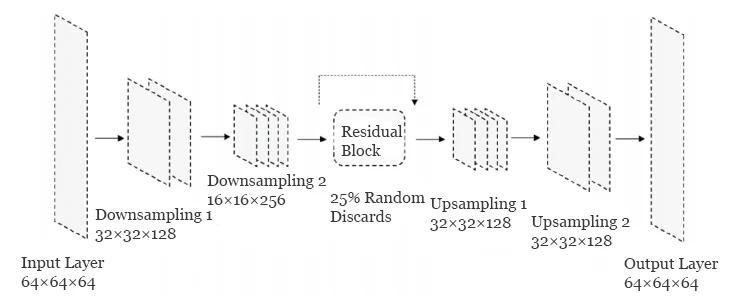 The generator utilizes a U-shaped convolutional neural network architecture, which includes downsampling layers, residual blocks, and upsampling layers, as detailed in Figure 2.