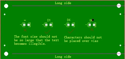 The font size of silk-screened characters should not be too small, and characters should be positioned away from vias to prevent misreading.
