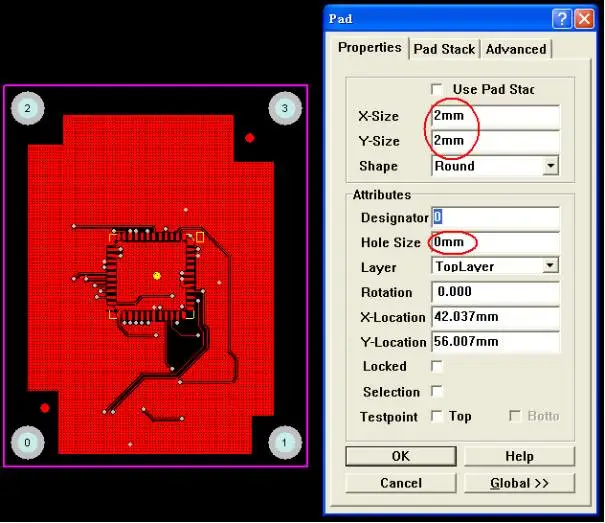 Specific location: Diagonally opposite corners of the board. These can be circular or square pads, and must not be mixed with pads for other components.