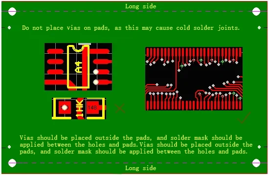 Drilling vias on pads allows solder paste to flow into the vias during reflow soldering, causing solder deficiency on the component pads and resulting in cold solder joints, as shown in the figure below.