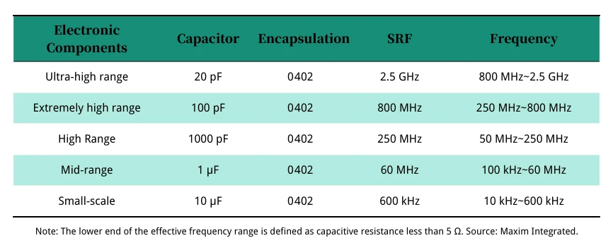 Due to the self-resonant frequency (SRF) inherent in actual capacitors, their effective frequency range is limited: SRF values can be obtained from manufacturers, but sometimes require direct measurement for characterization.