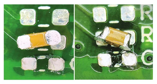 Through visual inspection and comparative tests involving manual reproduction of capacitor detachment using both T7 and Curve 7, the soldering results were satisfactory under the T7 temperature profile, with no instances of capacitor detachment observed.