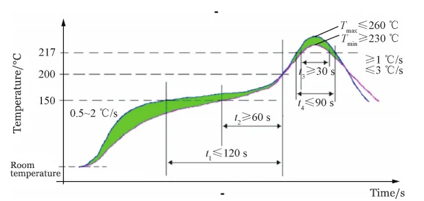 A comparison with the recommended oven temperature curve for QL-35/03 (Figure 2) and the industry-standard lead-free soldering oven temperature curve (Figure 3) reveals that the primary issues with Curve 7 include excessive dwell time in the reflow zone and an insufficient cooling rate in the cooling zone.