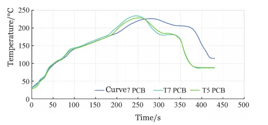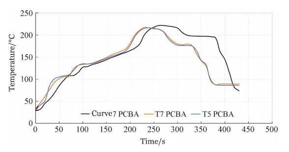 Further practical soldering tests were conducted using scrap PCBA (Figure 8), and the PCBA oven temperature profiles for Curve 7, T5, and T7 were measured under identical conditions (Figure 9).