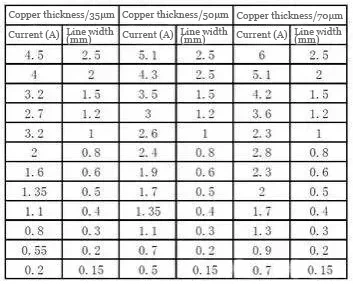 The table below shows the relationship between copper thickness, line width, and current in PCB design:
